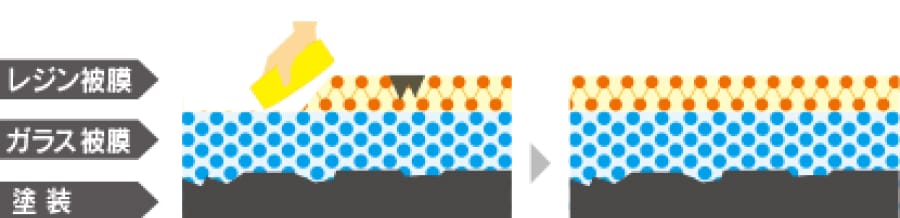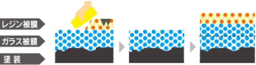 2層目の特殊な「(2)レジン被膜」は無機質のガラス被膜の上に密着することが出来、しかもその密着面の反対側にあたる表面には有機質の性質を持つ特殊なレジン被膜です。
